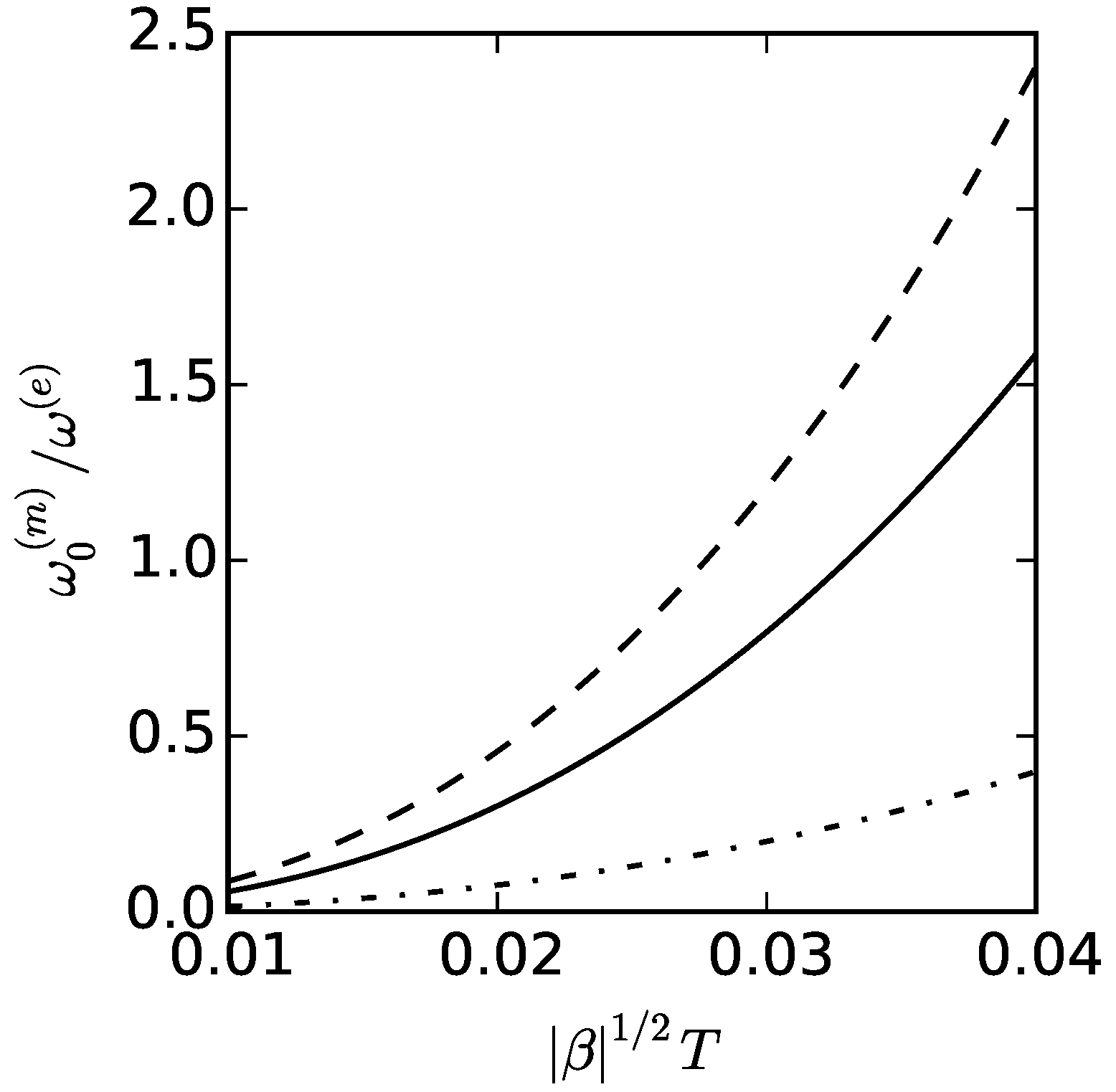 The oscillation frequency increases when and decreases when , and there is a maxima when . These oscillations depend only on the values of β and T. In a typical experiment, the oscillation frequency is much larger than depicted in Figure 2 or Figure 3. For the remainder of the paper, it will be assumed that the interferometer time is tuned to be at the peak of an oscillation, which will be referred to as .