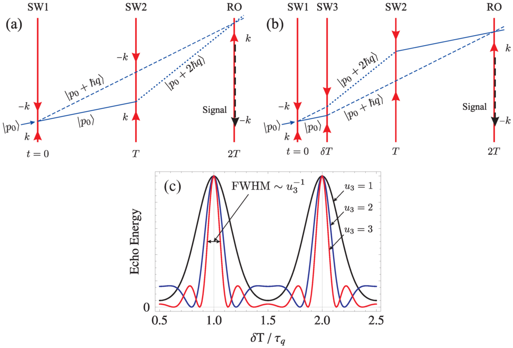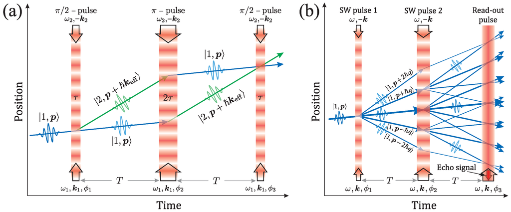 An alternate configuration involves a three-pulse stimulated echo AI [32,75,123,130], as shown in Figure 6b. Here, the first SW pulse creates a superposition of momentum states separated by . A second SW pulse applied at produces momentum states that are co-propagating at a fixed spatial separation with the same momentum during a central time window of duration . A third SW pulse applied at causes the co-propagating states to interfere at the echo time , resulting in a density grating. Just like the two-pulse AI, the grating formation is associated with interference of momentum states separated by . The signal amplitude as a function of pulse separation shows no recoil modulation and exhibits a fixed angular frequency due to the velocity acquired by the atoms during the time interval in the presence of gravity. The period of the signal amplitude is given by .