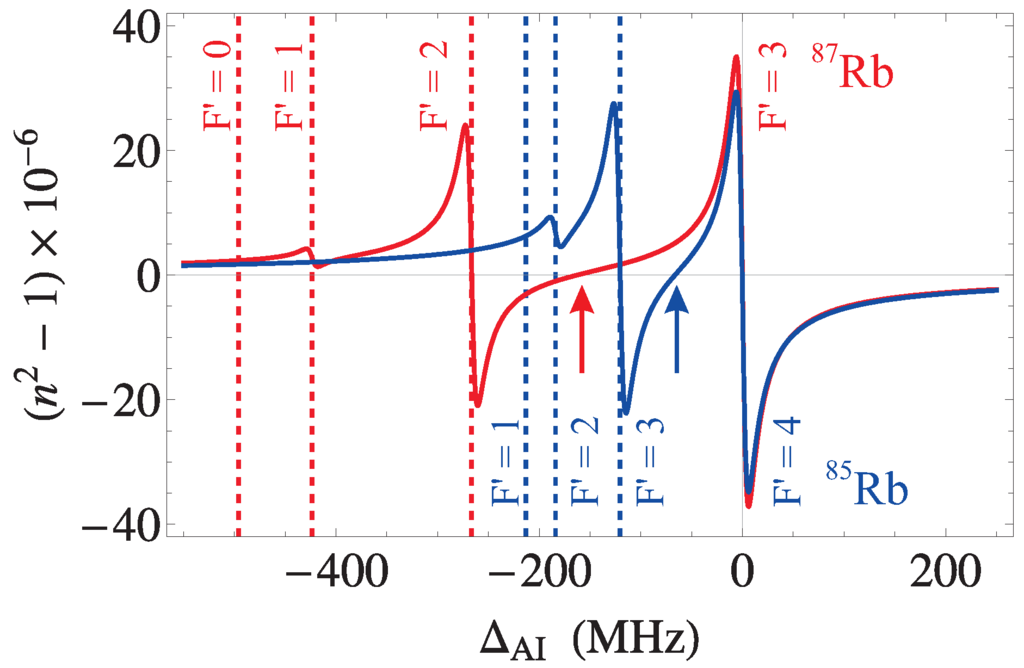 We now discuss techniques for reducing the aforementioned systematic effects. Equation (19) for the refractive index suggests that the relative correction to can be reduced by decreasing the sample density, ρ, or by increasing the excitation beam detuning, . However, the current configuration of the AI relies on a large number of atoms to achieve a sufficient signal-to-noise ratio. Thus, a decrease in the sample density leads to a reduction in the signal size. Furthermore, the sensitivity of the three-pulse AI relies on a relatively strong atom-field coupling in order to excite many orders of momentum states. An increase in the excitation beam detuning without a corresponding increase in the field intensity leads to a reduction in the sensitivity to . The refractive index systematic could be reduced by a factor of by a 10-fold reduction in the rms density of the sample, accompanied by a 100-fold increase in the detuning. This would require an increase in the excitation field intensity by a factor of 100 (corresponding to W/cm) in order to retain the same sensitivity to . A more promising way forward is to utilize the frequency-dependence of the refractive index, which exhibits “magic” frequencies where the systematic shift cancels, as shown in Figure 5. These frequency are located between two excited state manifolds, where the dispersive corrections to the refractive index due to each state have the same magnitude but opposite sign. Since these frequencies are independent of the density ρ, they are ideal for cancelling the refractive index shift due to both the cold-atom sample and the background vapor [56]. Using this feature of the refractive index, one can avoid both reducing the sample density and using high-intensity excitation beams.