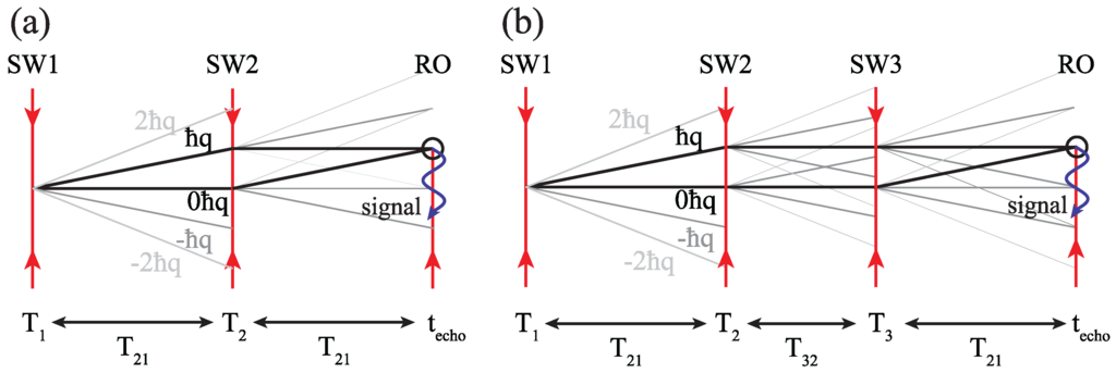 Recoil diagrams for (a) two-pulse and (b) three-pulse AIs in the absence of gravity. Only a subset of all trajectories are shown. SW refers to standing wave pulses and RO is a traveling wave read-out pulse. The SW pulses, composed of two counter-propagating traveling wave components, each with wave vector , diffract atoms into a superposition of momentum states separated by . For both two-pulse and three-pulse AIs, the backscattered signal arises from interferences between states differing by at the echo time.