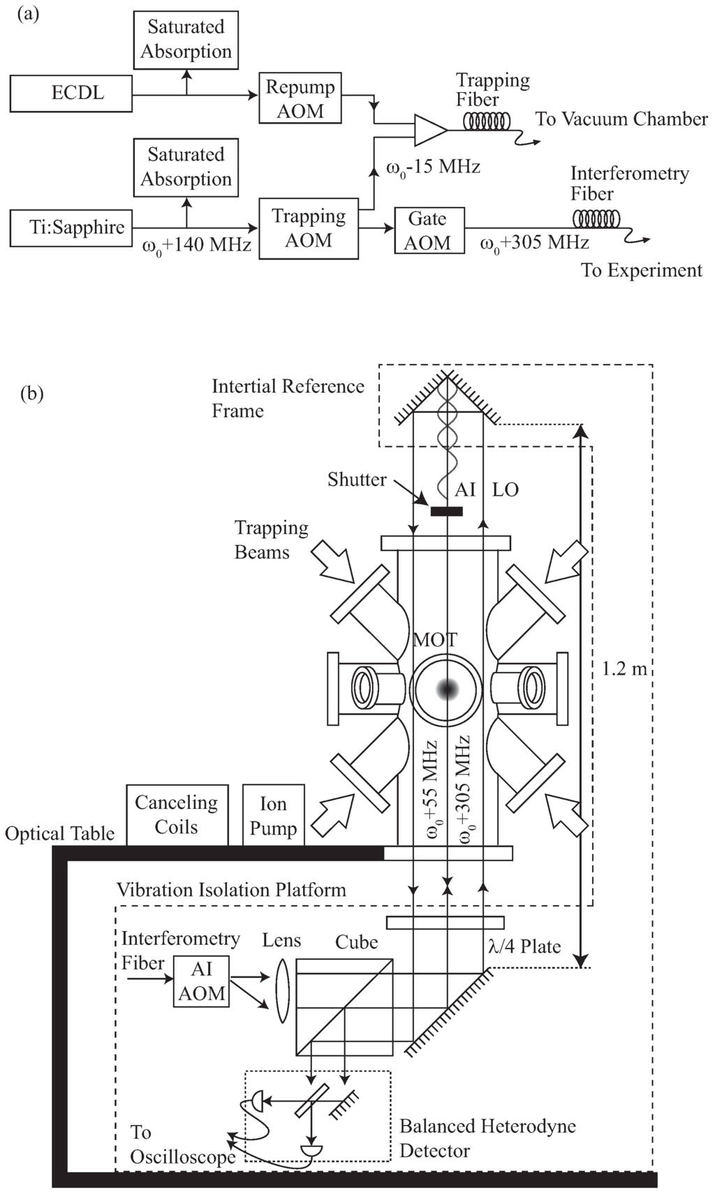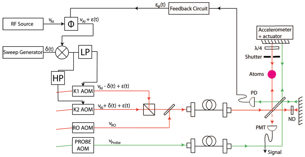 Figure 7a shows a block diagram of the experimental setup. The details are described in [58]. A Ti:Sapphire laser is used to generate light for atom trapping and interferometry using a chain of acousto-optic modulators (AOMs) that serve as frequency shifters and amplitude modulators. All these elements are placed on a pneumatically-supported optical table. Light from these AOMs is transported to the atom trap using angle-cleaved, anti-reflection (AR) coated optical fibers.