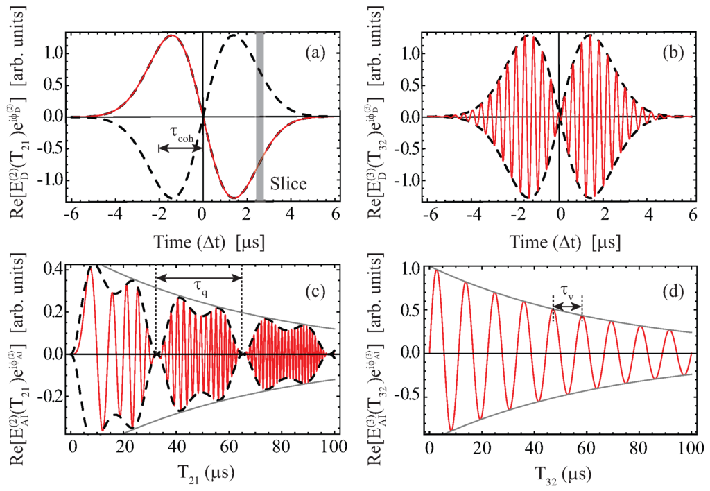 Here, we have made use of the Bessel function identity [79] to simplify the sums over n and m in Equation (12). Two important features of the interference pattern are now clear. First, as a result of velocity dephasing, the grating only exhibits non-vanishing contrast for a timescale of μs in the vicinity of the echo time. Second, the atomic recoil frequency, which initially appeared in the phase of the wavefunction, now affects only the contrast of the interference pattern. This feature of echo AIs alleviates the need for phase sensitivity in a recoil-sensitive experiment, since the effect can be measured in the back-scattered signal intensity. This type of AI has also been referred to as a “contrast” interferometer in the context of recoil measurements with ultra-cold atoms [81,82].
