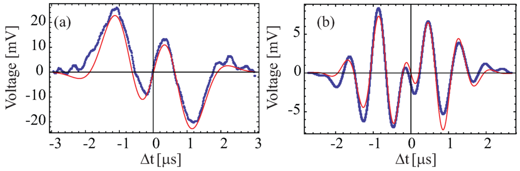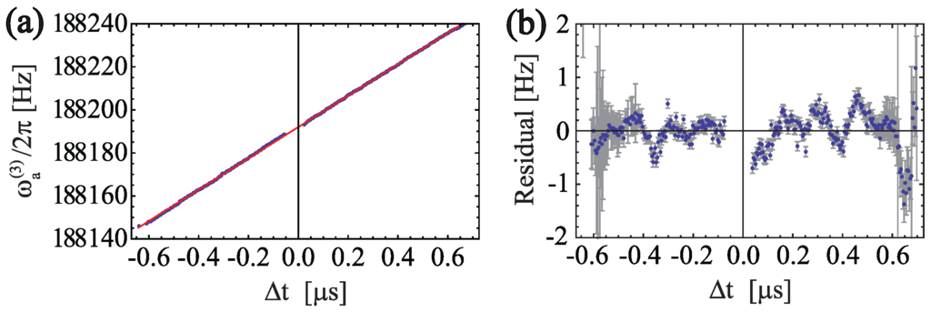 and the recoil frequency, , is extracted from the fit. In this model, erfc is the complementary error function, and the parameter υ, which determines the amount of asymmetry in the lineshape, is the same for all fringes. The fit to the data shown in Figure 4a yielded a reduced chi-squared of for degrees of freedom. This corresponds to a relative statistical precision of ∼180 ppb in —representing a factor of ∼9 improvement over previous work [100].