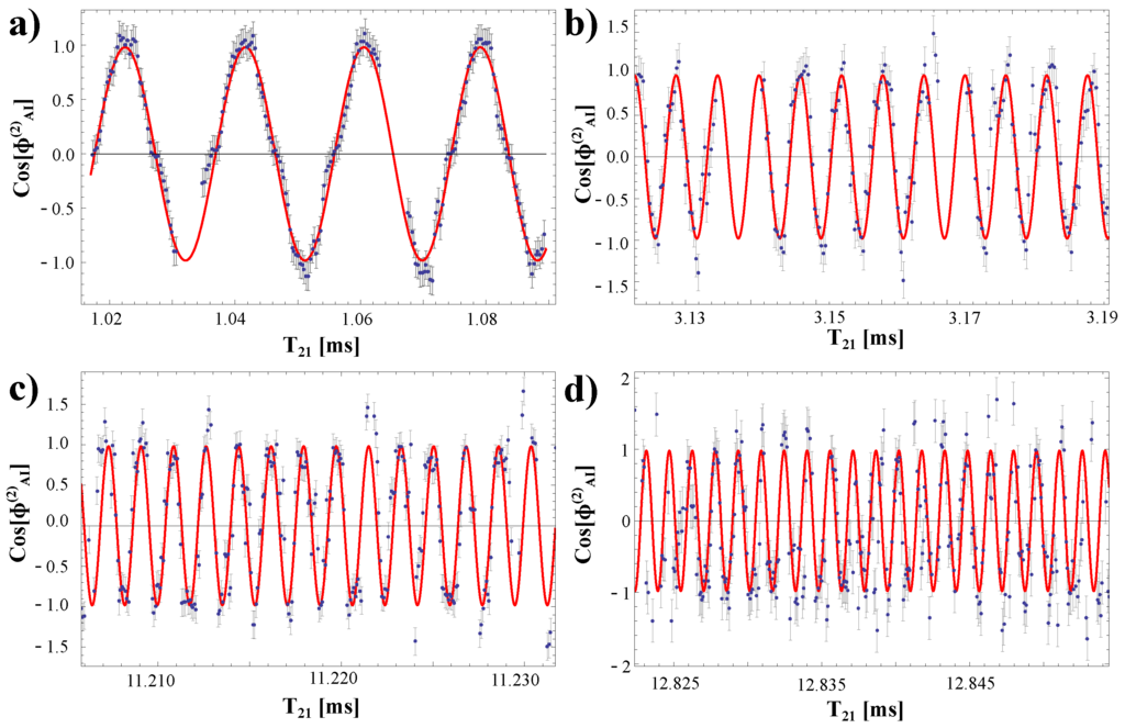 There is an ongoing, international effort to develop precise, independent techniques for measuring the atomic fine structure constant, α—a dimensionless parameter that quantifies the strength of the electromagnetic force which lies at the heart of light-matter interactions. These measurements can be used to stringently test the theory of quantum electrodynamics (QED). Historically, two types of determinations of α have been carried out: (i) those that use other precisely measured quantities to determine α through challenging QED calculations [88,89], and (ii) those that are independent of QED, and depend on only the quantities appearing in the definition , where e is the elementary charge, is the vacuum permittivity, h is Planck’s constant and c is the speed of light. Some examples of α determinations that require QED are the measurements of the anomalous magnetic moment of the electron (precise to 0.37 ppb) [90], and the fine structure intervals of helium (precise to 5 ppb) [91]. The most precise examples of QED-independent determinations are those based on measurements of the von Klitzing constant, , using the quantum-Hall effect [92,93], and the ratio using (i) Bloch oscillations in cold atoms [13,94] and (ii) atom interferometric techniques [6,12,14,15]. Within these examples, atom interferometry has emerged as a powerful tool because of its inherently high sensitivity to , which can be related to α according to
