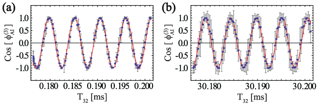 The back-scattered light at frequency is detected as a beat note at frequency using a heterodyne technique [55]. Although the quadratic accumulation of phase as a function of is appealing for a precision measurement of g (among various interferometer geometries, this configuration also encloses the largest space-time area), the signal amplitude exhibits recoil modulation as well as a chirped frequency, resulting in the need for a complicated fit function to extract g. The signal from the two pulse AI is analogous to the interference fringes recorded by the falling corner-cube optical interferometer discussed in Ref. [112].