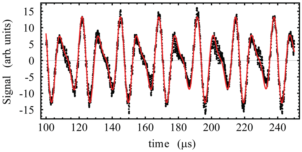 Measurements of were obtained using the modified three-pulse AI by measuring the echo energy as a function of the third pulse time, , as illustrated in Figure 4a. This figure shows a measurement of in Rb on a time scale of ms, which was acquired in 15 minutes. Clearly, the shape of the fringes does not resemble that predicted by the theory shown in Figure 2(c). This is due to the contribution from each of the magnetic sub-levels in the ground state of Rb, which tend to smear out the higher harmonics in the signal as a result of their different optical coupling strengths. Furthermore, the presence of additional, nearby excited states ( and 3 in the case of Rb) produces an asymmetry in the fringe lineshape [56]. This effect is reduced in Rb because the frequency difference between neighboring excited states is larger. To measure , the data are fit to a phenomenological model that consists of a periodic sum of exponentially-modified Gaussian functions