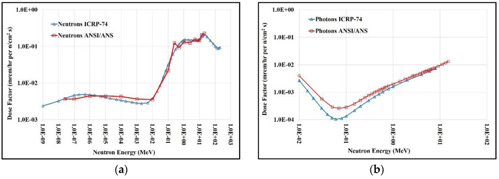 Despite the small amount of irregularities in conversion factors between the two sets, it appears that the health physics community affirms that there are no significant differences between both sets, where it is believed that accepted levels of accuracy lie around 20%. Figure 2 shows the flux-to-dose rate conversion factors for photons and neutrons from ICRP-74 and ANSI/ANS. The conversion factors are plotted on a log-log scale as recommended by the ICRP and ANSI, creating a straight line between any two points, for the proper interpolation between points.