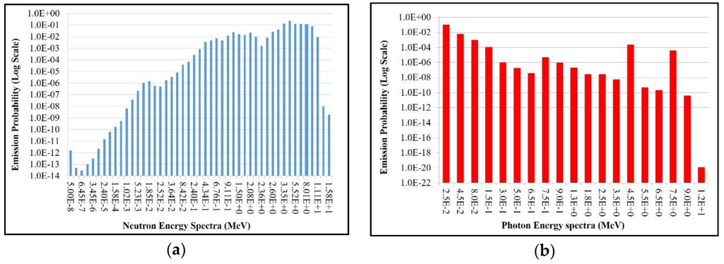 The energy spectra of the neutron/photon source energies (MeV) and the probability whereby neutrons/photons are emitted at that particular level of energy [15,16] were modeled. Source neutron and photon intensities (1.91 E+6 neutrons/s and 3.455 E+9 photons/s) and spectra were modeled in MCNP using the source specification card (sdef) with 47 energy bins for neutrons and 19 energy bins for photons. Figure 3 depicts the MCNP modeling of the source emission of neutrons and photons, including its probability distribution.