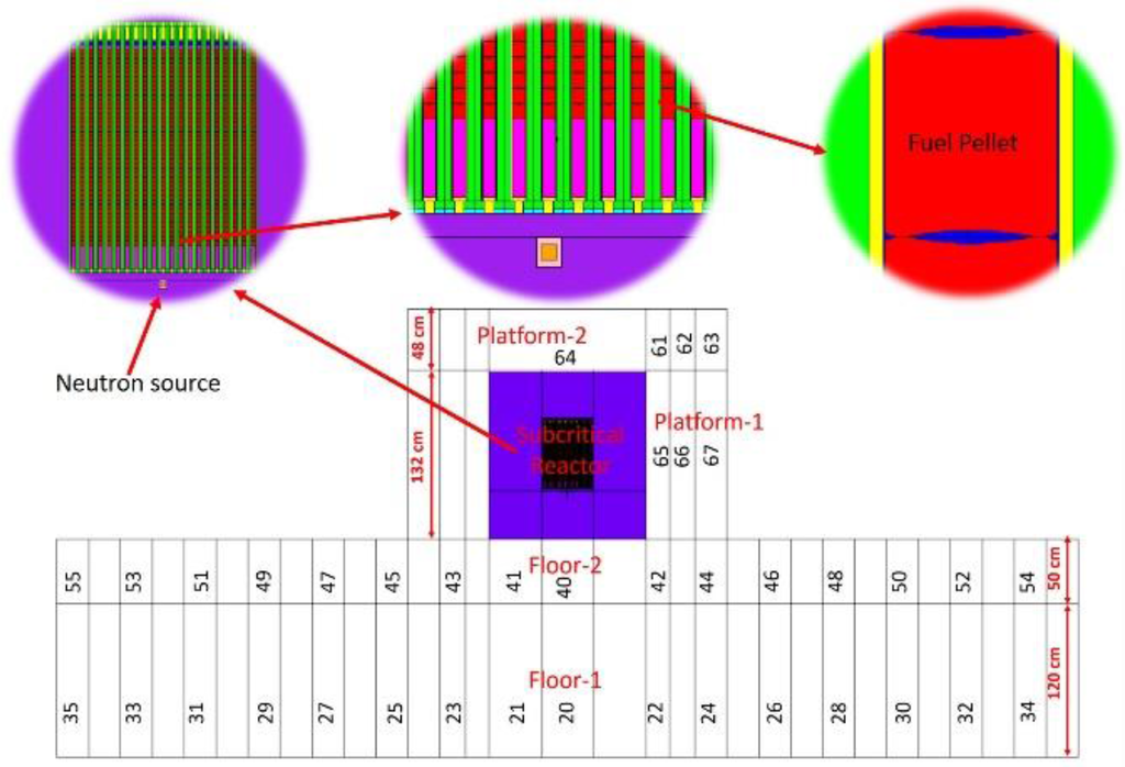 MCNP cross-sectional view (x-z) of dose mapping zones in the subcritical reactor hall, showing the height of floor 1, floor 2, platform 1, platform 2 (in red), and the cell numbers (in black). Magnified view of the core with the neutron source, fuel rods, and fuel pelt are shown on top.