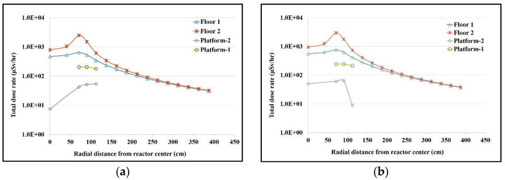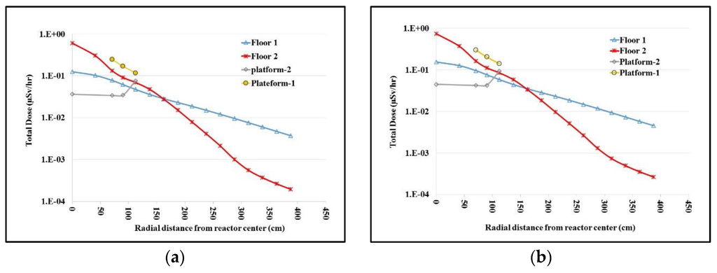 Figure 5a shows the calculated total dose rate obtained during normal operation versus the radial distance from the center of the reactor. These results are obtained using the ICRP-74 flux-to-dose equivalent rate conversion factors. From the figure, it can be inferred that the maximum total dose rate is 6.09 E−01 µSv/hr in areas that are situated on floor 2, below the reactor. This is followed by the area close to the vessel on the training platform (platform-1), where the calculated dose rate is 2.48 E−01 µSv/hr. In absolute terms, the figure depicts that aside from the area located below the reactor core, the second highest dose during operation was calculated on the training platform.