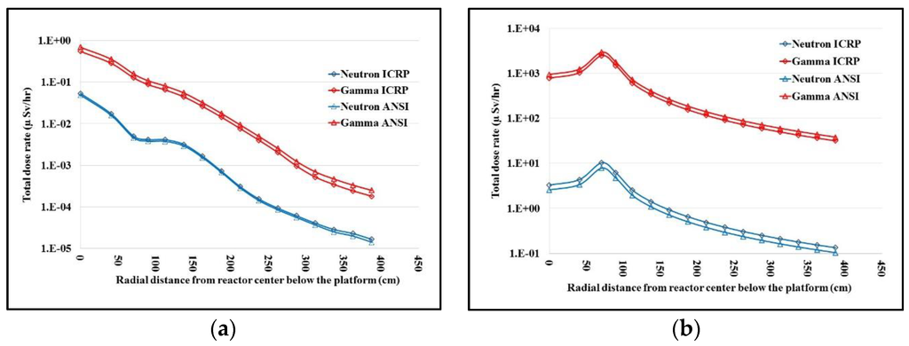 The total dose rate in the reactor hall vs. the radial distance from the reactor center during normal operation: (a) Using ICRP-74 flux-to-dose conversion factors; (b) Using ANSI/ANS flux-to-dose conversion factors.