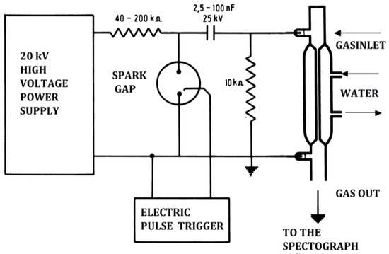 The pulsed discharge tube was built at CIOp [16]. This light source consists of a Pyrex tube 100 cm in length and with an inner diameter 0.5 cm in which the gas excitation is produced by discharging a bank of low-inductance capacitors ranging from 20 to 280 nF, charged with voltages up to 20 kV. The schematic of the electric circuit is shown in Figure 1.