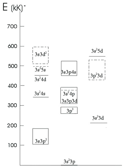 In a recent analysis [56], 61 lines as transitions between levels of configurations 4p3, 4s25p, 4s4p4d, 4s4p5s, and 4s4p5p were classified for the first time and all the 18 energy levels belonging to 4s4p5p configuration except one were determined. Eight new energy level values corresponding to configurations 4s4p4f and 4p24d, supported by 26 new classified lines, were also determined and used in the interpretation of the observed 4s4p5p configuration. In Figure 6, the gross structure of the observed Kr VI configurations is shown. The dashed arrows indicate the 4s4p5p–4p3, 4s4p5p–4s25p, 4s4p5p–4s4p4d, and 4s4p5p–4s4p5s transitions identified in this work.