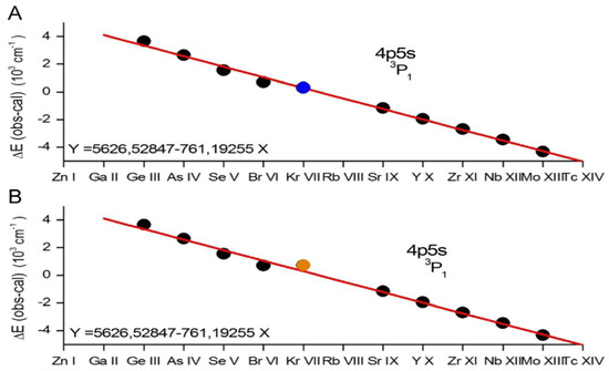 Six times ionized krypton belongs to the Zn I isoelectronic sequence and has the ground configuration 3d104s2. Due to the considerable interest in the diagnosis of high-temperature laboratory and astrophysical plasmas, the spectra of this sequence has been extensively studied and the first detection of Kr VII in a white dwarf was recently reported [39]. The spectra of the Zn-like Kr ion has been studied by the use of different light sources and by using a θ-pinch and a pulsed electrical discharge tube [16] in the region from 300 to 4800 Å. The values for the previously known energy levels were revised and a new extended analysis resulting in 115 new classified lines and 38 new energy levels belonging to 4s5s, 4s6s, 4p4f, 4s6d and 4p4d, 4s5p, 4s4f, 4p5s, 4s5f, 4s6p, 4s6f even and odd configurations were completed [57]. For the prediction of the energy level values we studied the behavior of the difference between the observed and calculated energy values along the isoelectronic sequence. As an example, Figure 7 shows the interpolated value for the 4p5s 3P1Eobs–Ecal of Kr VII in the Zn-like sequence. The adjusted energy difference value represented in A using our new energy level value in 587029 cm−1 fits better than the value in 587068 cm−1 reported in Ref. [58], as shown in B.