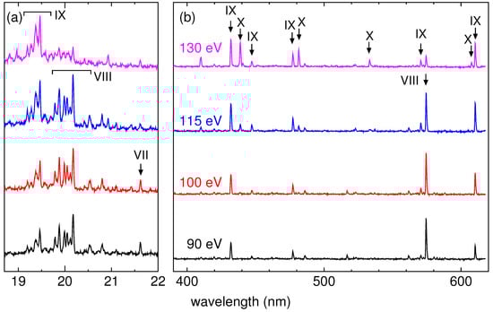 In the previous study with the Livermore EBIT, the EUV spectra of tungsten ions were observed with wavelength and electron energy ranges similar to the present study, and several transitions of W VII and VIII were identified [4]. Our spectra shown in Figure 1a are generally consistent with their spectra; thus, through the comparison with their spectra, the lines of W VII and VIII can be identified as shown in the figure. For example, the line at 21.6 nm is assigned as the – transition of W VII. A cluster of lines near 20 nm mainly corresponds to the – transitions of W VIII. It can be confirmed that the W VII lines were observed at 90 and 100 eV, and became weak at 115 eV, whereas the W VIII lines kept increasing from 90 to 115 eV and became weak at 130 eV. Their difference in energy dependence reflects the fact that the charge distribution shifted to a higher charge as electron energy increased. Based on the energy dependence, a cluster of lines near 19 nm can be assigned to W IX although these were not identified in the previous Livermore spectra. According to the calculation by Ryabtsev et al. [6], a lot of transitions in W IX are predicted near 18 to 19 nm. We consider that the cluster of lines near 19 nm in the present EUV spectra corresponds to a part of the predicted lines although a detailed analysis and identification are in progress. The present identification seems to be inconsistent with the ionization energy values [5] because W VIII (122 eV required) and W IX (141 eV required) lines can be found in the spectrum at an electron energy of 90 eV. Similar inconsistency is also found in the spectra of the previous Livermore spectra, where they observed W VII (65 eV required) lines at 43 eV and W VIII (122 eV required) lines at 72 eV. Ionization from metastable excited states [21,22,23] may account for this inconsistency though we are not sure at present.