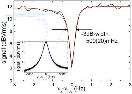 The trap is located at the centre of a superconducting solenoid of high homogeneity and temporal stability. To avoid charge exchange of the trapped ion due to a collision with residual gas, the trap is cooled to 4 K, which assures efficient cryo-pumping. A pressure of better than 10 mbar in the trap volume has been demonstrated. Consequently, ion storage times of many months are routinely achieved. Attached to the trap electrodes are superconducting resonance circuits of high quality factors. They serve for trapped-ion detection by measuring the image currents induced in the trap’s electrodes. Apart from the trap, the resonance circuits and the associated electronics are also held at 4 K to reduce thermal noise. Details of the experimental setup can be found in Reference []. Keeping the ion oscillation frequencies in resonance with the detection circuits leads to ion cooling by energy dissipation into the circuits (‘resistive cooling’). A detection of the ion in thermal equilibrium with the environment is performed by a Fourier transform of the circuit’s noise power: The oscillating ion can be represented as a series resonance circuit of very high quality in parallel to the detector. This circuit shortcuts the noise voltage of the detection circuit and leads to a minimum (‘dip’) in the noise spectrum. Figure 2 shows, as an example, the signal from the axial oscillation of a single C ion. The central part of the Fourier spectrum is shown, demonstrating the small width of the dip of about 500 mHz in a total oscillation frequency of  kHz.