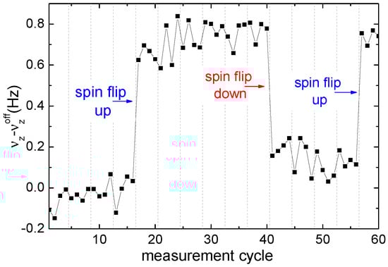 where e is the charge and m is the mass of the electron. Transitions between the two spin states of the electron are induced by a microwave field at a frequency of (nominally) 104 GHz. In a perfect Penning-trap, the spin precession is completely decoupled from the ion’s oscillation and cannot be measured directly. Hence, we induce coupling by making the trap’s magnetic field inhomogeneous on account of a ferromagnetic ring electrode that locally distorts the otherwise homogeneous magnetic field (“magnetic bottle”). To first order, it leads to a quadratic dependence of the B-field on the spatial coordinate: . The additional force  of the inhomogeneous B-field acting on the spin magnetic moment adds to or subtracts from the electric trapping force, depending on the spin direction, and leads to a change in the oscillation frequencies (‘continuous Stern–Gerlach effect’ []). For the axial direction, the frequency change is