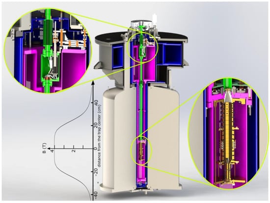 Figure 7 shows an overview of the experimental setup. The left-hand side is a schematic of the cryostat with the trap chamber, visible through the cutout of the surrounding superconducting magnet. It has a warm bore with 160 mm diameter and features a central field strength of 7 T at a field inhomogeneity of below 0.1 ppm in the trapping region.