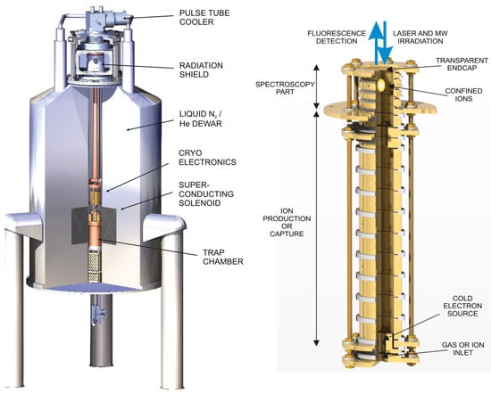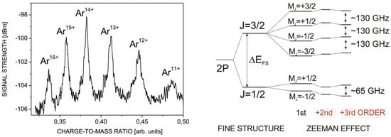 The cryostat cooling the trap chamber and electronics is a pulse tube cooler inserted from the top. It cools the setup to 4 K with 1 W of cooling power. The trap chamber is acoustically isolated from the cold head by stranded wires to minimize vibration. The right-hand side shows a schematic of the Penning-trap arrangement, consisting of two main parts, one for spectroscopy (on the top) and the other for ion production or ion capture from external sources. The source part of the trap arrangement is basically a cylindrical open-endcap Penning-trap equipped with a cold electron source (HV field emission tip) and a cold gas source. The setup allows an electron beam to be reflected between the outer electrodes, ionizing present gas by electron-impact ionization similar to an EBIS in a reflectron mode []. The cold gas source is represented by a heatable baffle arrangement with initially frozen-out gas that is released when heated. In this fashion, ions of certain charge state distributions can be produced like shown for argon in Figure 8 (left). Charge states can be selected by resonant ejection of unwanted species, and ions of interest are transported to the spectroscopy trap where they can be stored for periods of the order of days. The right-hand side of that figure shows the fine structure of Ar (boron-like argon) and the Zeeman effect due to the magnetic field of the trap. This ion species serves as a test system while commissioning of the setup. Also indicated in the figure are higher-order contributions to the Zeeman effect, which can be resolved by the envisaged combination of optical and microwave spectroscopy.