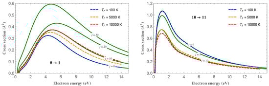 Figure 1 shows the cross-section for the one-quantum vibrational transitions, , for and different j values, as indicated in the plots. For the transition (left panel), the cross-section peaks follow the trend of the increasing value of the cross-section with increasing j. An opposite behavior is observed for the case (right panel). In Figure 1 are also shown the cross-sections thermally averaged over an equilibrium Boltzmann distribution of the rotational states for different temperatures, according to the equation: