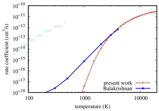 In the modelization of plasmas of astrophysical interest [], as well as of plasmas for energy production in nuclear fusion [] or entry into planetary atmospheres [], there is a need for detailed data concerning rovibrational energy exchange and dissociation in molecular collisions. Typically, the range of energies/temperatures involved is quite large: for example, in a probe entry into Jovian atmosphere, the range of temperatures extends from 200 K to more than 20,000 K [,]. This is a challenge for any computational method for molecular dynamics. An accurate quantum mechanical method is surely the right choice in the low energy regime, but it becomes rapidly unfeasible as the total energy increases. On the contrary, the quasi-classical method is not reliable at very low energies, but it becomes rapidly accurate as the total energy increases. A very clear result concerning these opposite and complementary trends has been obtained in [], where the reaction: