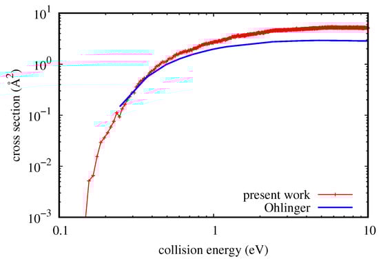 Concerning rovibrational energy transfer, a comparison is shown in Figure 3 between rate coefficients for the transition (v = 2, j = 0) → ( = 1, = 8) as obtained in this work and by Balakrishnan et al. [] using the accurate QM close-coupling method. It is clear that there is a complete disagreement at low temperature, as well as a convergence of the QCT result to the QM one for temperature values greater than 2000 K, as expected. These results are globally confirmed also for all of the other transitions considered in the QM calculations in []. As a consequence, also in this case, the double-approach QM/QCT could be very efficient in calculating the rate coefficients for a complete set of rovibrational transitions for applicative purposes, merging the results from QM and QCT methods. A purely non-reactive case is more challenging for quasi-classical calculations than a case including reaction []; in fact, the difficulty of the QCT method in treating non-reactive transitions at low collision energy [] is well known, due to the classically forbidden nature of the process []. This has nothing to do with quantum mechanical tunneling through potential barriers or with resonances; it consists of the failure of QCT method in correctly detecting the final rovibrational actions of molecular products when the exchanged energy is comparable to one quantum in a non-reactive process. On the contrary, when collision energy is sufficiently higher than the transition energy (independently of the exothermicity of the process), the QCT is able to correctly calculate the final product rovibrational state, as implicitly shown also by Figure 3, and it continues smoothly to exact QM results with increasing computational efficiency. Concerning the dissociation process, two possible channels should be considered (see [] for details). The first one is the three body dissociation, obtained directly from quasi-classical calculations. The second one is the rovibrational energy transfer to quasi-bound states (resonances), i.e., states classically bound but with a finite quantum-mechanical lifetime. The fraction of dissociation obtained from this last process depends on kinetic parameters (typically the mean collision time), and therefore, it is useful to consider it separately from the three body contribution. Concerning this last one, in Figure 4, there is a comparison of cross-sections with the QM results of Ohlinger et al. [], obtained with a modification of a non-reactive QM code. In that case, dissociation is considered as a rovibrational energy transfer to continuum states and to quasi-bound states. Continuum states are approximated by considering positive energy pseudo-states limited by a sufficiently large artificial boundary.