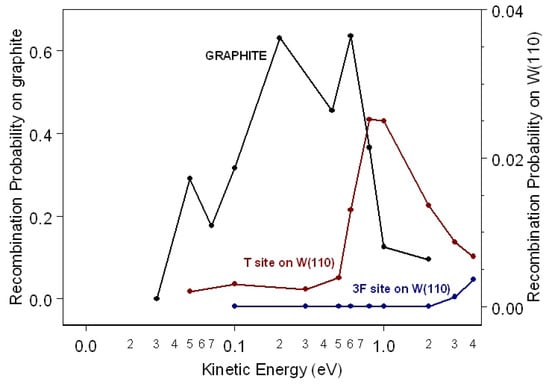 thus forming a molecule in a specific rovibrational state (). Here, is the energy released in the recombination process. The energy released in the reaction can be shared among the degrees of freedom of the newly-formed H molecules (rotations, vibrations, translation and, possibly, electronic) and the degrees of freedom of the substrate (phonons and, possibly, electrons). The chemistry of H molecules’ formation on the W(110) at surface temperature = 700 K via E-R reaction, for two different specific adsorption sites on the surface, is investigated and compared with H formation on a graphite surface. The W(110) surface exhibits three chemisorption sites: the 3F site (in the center of triangle formed by three W atoms), the T site (corresponding to a W atom) and the B site (placed in the middle between two adjacent W atoms). In the case of a graphite surface, the active sites are: T (corresponding to a C atom), B (placed in the middle between two adjacent C atoms) and C (the center of hexagonal unitary cell). In this work, we compare the results obtained on the T and 3F site on W(110) and on the T site on graphite. The complete set of results obtained for the two heterogeneous systems are discussed in [,]. The dynamics of the E-R recombination reaction of H atoms on W(110) and graphite (0001) has been investigated by using a time-dependent semiclassical method. The method, fully described in [], gives a coherent description of elementary molecular surface processes, and it is able to describe some of the most important features of surface reactions and surface phenomena, including the energy exchange mechanism between the molecules or atoms interacting with the surface and the phonons and/or electrons of the substrate. The recombination probability as a function of the kinetic energy of the impinging H atom for H on the T and 3F site on W(110) is shown in Figure 5 and compared with the probability obtained for recombination on the T site on graphite ( = 800 K).