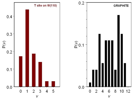 The maximum of the recombination probability on the T site on graphite, occurring at eV, is more than 20-times higher than that obtained for the T site on W(110) that assumes a maximum value of 0.025 at 0.8 eV. We note that graphite exhibits a higher catalytic activity in the complete range of collisional energies considered. As said above, the reaction mechanism considered here is a source of vibrationally-excited molecules. The final vibrational distributions for the H formed, assuming that the impinging atom has a kinetic energy of 0.8 eV and H is placed on the T site on W(110) and on graphite, are reported in Figure 6. It appears that molecules formed on graphite populate the complete vibrational ladder with a main peak in v = 9 and two secondary peaks in v = 3 and v = 10, respectively. On the contrary, molecules formed on W(110) populate only the first five levels with a maximum population in v = 1. Therefore, graphite, being more reactive, represents an effective substrate for the formation of vibrationally-pumped H molecules.