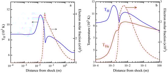 This behavior can be observed in the profile of atomic temperature and of free electron molar fraction, reported in Figure 7a. The electron temperature is heated up to 11,000 K at mm and, after the combination of radiative decay and ionization from excited atomic states, overcomes the excitation, making decrease as the electron density increases. At about 30 mm, there is the maximum of the electron molar fraction, while at mm, the minimum of is observed, followed by a maximum at mm. It should be noted that in correspondence with the minimum of , there is a change in the slope of the electron molar fraction. This behavior can be explained by electron-proton recombination in electronically-excited states, which slows down the recombination process sustaining ionization, not only because this process has a smaller threshold from H (n≥ 2), but also for the heating of the tail of the electron energy distribution due to superelastic collisions, transferring energy from excited states to electrons. Similar behaviors are observed in the shock simulation of the Jupiter atmosphere, as displayed in Figure 7b, showing higher maxima in the electron molar fraction and in H temperature peaks, due to the higher free stream Mach number.