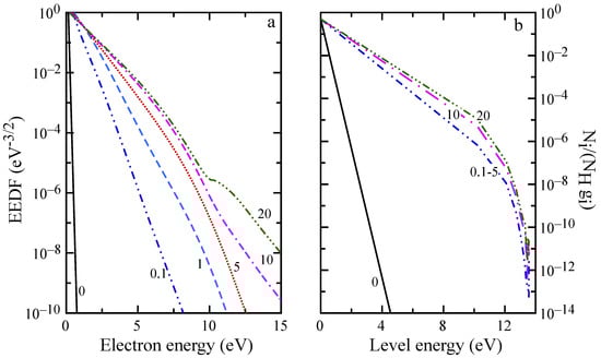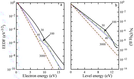 The evolution of macroscopic quantities is reflected also in the distributions, as can be observed in Figure 8 and Figure 9. For distances below 5 mm, the EEDF and internal level distribution presents the characteristic shape observed in the ionization regime [] with high energy electrons depleted by inelastic processes, while high energy atomic levels are underpopulated because of ionization. EEDF deviates from this behavior already at mm, due to superelastic collisions, which sustain the distribution tail also at mm (see the plateau in Figure 9a), even if the low energy distribution is already in equilibrium. After 20 mm (see Figure 9b), recombination repopulates the higher energy levels while the population of first excited states is decreasing because of radiative processes and superelastic collisions.