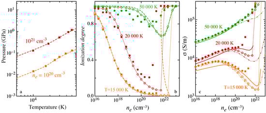 Debye hydrogen plasma: (a) pressure isochors (closed squares) as a function of temperature (dashed lines) []; (b) ionization degree as a function of total (bound + free) electron density, for different temperatures (full circles), including or neglecting (open circles) the effect on the atomic electronic levels (dashed lines) results from []; (c) electrical conductivity as a function of the total (bound + free) electron density, for different temperatures, including (full circles) or neglecting (open circles) the effect on atomic electronic levels in the equilibrium calculation (solid lines []) (dashed-dotted lines []).