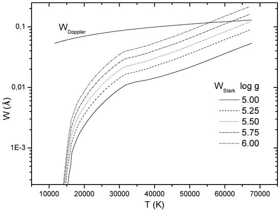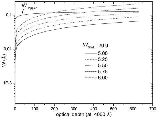 In Figure 2 and Figure 3, we present Stark and Doppler widths for Ar II (P) 3d D–(P) 4p P ( = 4371.33 Å) spectral lines as a function of the temperature of the atmospheric layers and as a function of optical depth respectively. Figure 2 shows that for the atmospheres with log g = 6.00 and log g = 5.75, Stark width become larger than Doppler width from the atmospheric layer with temperature T = 55,000 K and T = 60,000 K respectively. For the atmosphere with log g = 5.50, Stark width is comparable to Doppler width only for the dipper layers of the atmosphere. For the atmospheres with log g = 5.25 and log g = 5.00, Stark width is dominated by Doppler width in all atmospheric layers. Due to the different behavior of Gaussian and Lorentzian distributions, Stark broadening may be important in the line wings even when Doppler width is larger than Stark width.