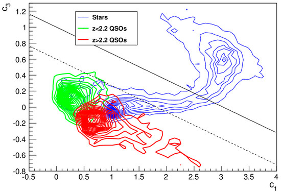The BOSS + MMT color selection criteria [6]. Locus of stars (upper blue contours), z < 2.2 quasars (lower left green contours), and z > 2.2 quasars (lower right red contours) in the c3 vs. c1 color-color plane. The upper solid line corresponds to the color cut c3 < 1.0 − c1/3 (loose, for point sources) and the lower dashed line to c3 < 0.6 − c1/3 (strict, for extended sources). c1 = 0.95(u − g) + 0.31(g − r) + 0.11(r − i), c3 = −0.39(u − g) + 0.79(g − r) + 0.47(r − i), where u, g, r, i and z are SDSS colors.