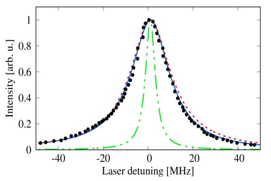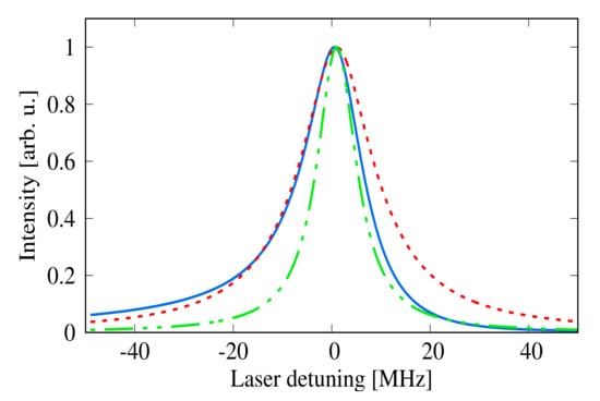 19). Note that the theoretical results well describe the experimental data. Both profiles for Na and Cs atoms have an asymmetry, manifested in a rapid drop of the right wings. This asymmetry is due to the upwards AC Stark energy shift (see Equations (