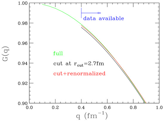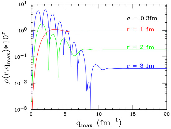 with . In Figure 9, we show calculated for three values of r using the standard dipole form factor, Equation (7). To reduce the oscillations resulting from the sharp cut-off of the integral at , the is averaged over a region around the selected r with a Gaussian weight of width , such that the values plotted represent some average density in the region centered at r; obviously, it is only this average density that is relevant for the shape of at low q.