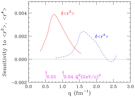 Figure 4 displays the expected behavior: at very low q, the form factor is not sensitive to R because of the smallness of the contribution of R to ; at the larger q’s, the effects of the forth (and higher) moments dominate. The world data in the q-region fm thus are mainly determining R. The region of sensitivity for the Zemach radii [80,81] is quite similar.