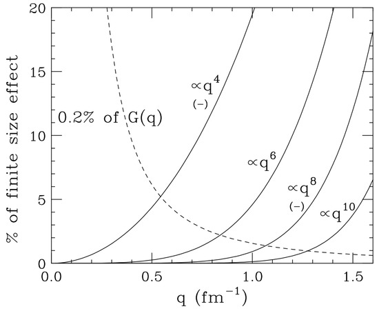 - Due to the peculiar shape of the proton density, the moments are large and the -terms strongly coupled [15]. This is illustrated in Figure 7 [88], which shows the contributions (in %) of the higher moments to the finite size effect FSE . In order to make the contribution of smaller than, say, 1% in R (2% in FSE), one has to restrict to an extremely small value of ≤0.34 fm (0.004 GeV).