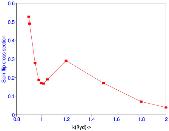 (Color online) Spin-flip cross section vs. the incident momentum k (Ryd).
