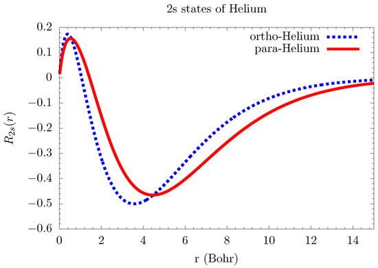 The energies are also different—and this may be where these details matter most. In Table 2, we compare the different calculations for the energy separation of the two different LS terms (para- and ortho-helium) of the 2s state of helium to the reference value from NIST [33,34]. Our matrix Hartree-Fock method reduces the discrepancy with experiment to 5% from the 15% discrepancy from Cowan [21]; see Table 2. A direct numerical two-electron solution (where we expand Equation (10) to two dimensions and include a monopolar repulsion term; this is not the Hartree-Fock equations) agrees well with the reference value.