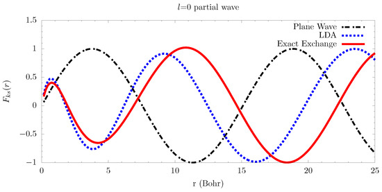 The changes in the free-electron wavefunction are shown in Figure 3 and Figure 4 for a distorted-wave treatment, where we assume that the atom is not perturbed by the presence of the free-electron. Figure 3 shows the free electron reacting to a hydrogen atom in the state, while Figure 4 shows the free electron reacting to a lithium atom in the configuration. In these figures, we also plot the plane-wave solution for the same k state, and a local-density-approximation (LDA) for the exchange contribution [21,35,36]. The changes in the wavefunction in Figure 3 are fairly minor, and the LDA gives fairly reasonable amplitudes for the inner 5 Bohr of the wavefunction. The lithium wavefunctions calculated with an LDA, on the other hand, are not nearly as good; the amplitudes of the exact exchange are lower by 30–50%. This means that if one were trying to accurately calculate the effects of penetrating collisions for multi-electron—meaning more than one electron—systems, the LDA wavefunction may not be accurate enough depending on the application.