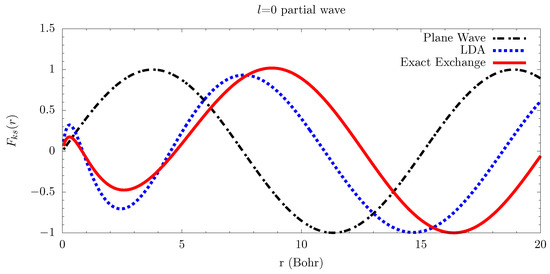 The partial wave of the free-electron wavefunction under different approximations. Black dot dashed is the plane wave, dotted blue is using an LDA to approximate the exchange correlations, and solid red is the exact exchange treatment. The states are reacting to the presence of a hydrogen atom in the state.