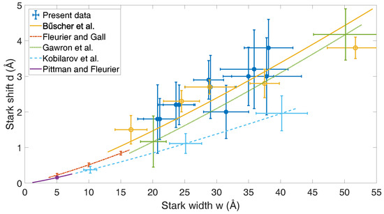 In Figure 4, the best fits to selected data from the literature are shown. The experimental data obtained in the present study agree well with the data from Büscher et al. [6] and Gawron et al. [5]. However, a large deviation from the data of Kobilarov et al. [4] was observed. The data of Pittman and Fleurier [3] and Fleurier and Gall [2] are in a significantly lower density range, so no direct comparison to the present data can be drawn. While there are more data on the Stark shift of He II P available in the literature (see references in [6]), this small selection illustrates the inconsistency of the experimental Stark shift data in relatively similar experiments. In all the experiments compared here, no intrinsic differences between the two distinct data sets [2,5,6,7] and [3,4] in terms of plasma source, working gas, or observation direction could be found. The experimental details are summarized in Table 2.