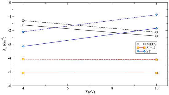 The quenching also leads to the Stark shift. All profiles show a “red” shift, and the codes that give broader lineshapes also give larger shifts. It should be noted that MELS does not include line shifts due to the electron collisions; only ions contribute to the shift. The results are summarized in Figure 7. For the sake of comparison, the shifts are scaled to the density of . It can be seen that all calculations demonstrate a slightly weaker than linear dependence on the density. This is in part due to the screening effect, resulting in a decrease of the microfield magnitudes and, hence, a smaller ion-induced shift. Such a positive correlation between the plasma temperature and the shift is indeed observed in the MELS results (recall these are only ion-induced shifts). On the other hand, the electron-induced shift in the impact approximation should decrease with T, which is observed in the ST results, whereas the SimU shift is practically independent of T, which we attribute to a significant cancellation of the two effects.