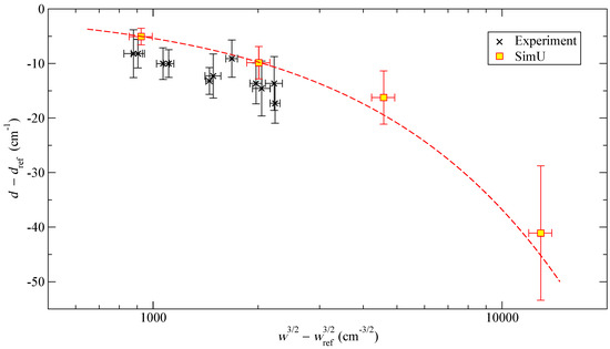 Figure 8 shows the present experimental data along with the simulations results. To eliminate the error due to the reference plasma, we present relative shifts and widths. To achieve a nearly linear relation between the Stark width and the electron density, is used instead of w. The sources of the calculation uncertainties are discussed in Section 4. The disagreement between the measurement and the simulation is obvious. All experimental points lie below the best fit to the SimU results and in many cases the latter passes outside the experimental error bars.