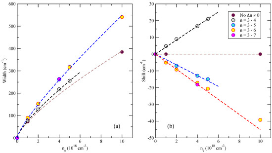 Quenching is a pre-requisite for determining the Stark shift of hydrogen-like lines; without a mixing of states with different n values, the Stark shift of a hydrogen-like transition in the dipole approximation is zero [11] (however, see a discussion on the detailed balance considerations below). The influence of different states on the line width and shift as calculated by SimU is shown in Figure 9. The higher levels mainly add to the linear term of the Stark width, which is associated with the electron impact contribution. Levels with have practically no additional effect on the width. Accounting only for mixing between the initial and final levels of the line, –4 results in a positive (“blue”) shift. The influence of reverses the shift, and the even higher makes the shift even larger by absolute value. However, appears to have an almost negligible effect, so higher levels are not taken into account here.