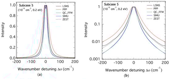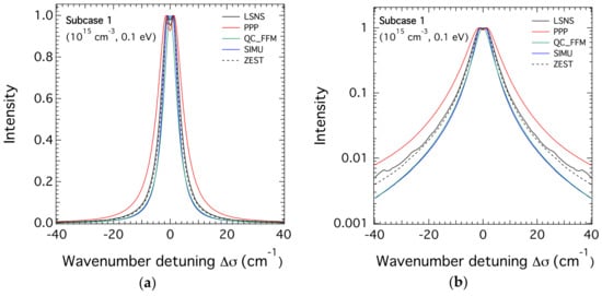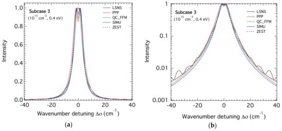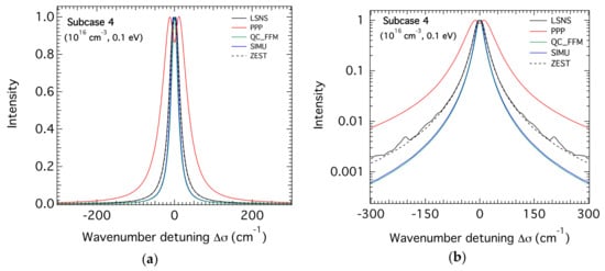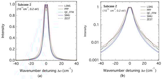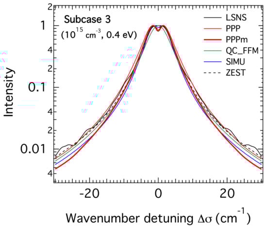 The results of the code calculations for the lower density case (ne = 1015 cm−3) are respectively illustrated for equal ion and electron temperatures of 0.1, 0.2, and 0.4 eV in Figure 1, Figure 2 and Figure 3 corresponding respectively to subcases 1, 2, and 3. It can be seen that all the codes except PPP are in an overall agreement in terms of widths and line shapes with some differences in the central line dip. The profiles calculated by PPP are broader than all the others, especially at the lowest temperature of 0.1 eV. This was excepted because this version of the PPP line shape code used for the treatment of the electron broadening the GBK (Griem-Blaha-Kepple) [] collision operator does not depend on the frequency. This operator is known to overestimate the broadening in comparison to frequency-dependent collision operators in the framework of the impact approximation used for the treatment of the emitter-electron interactions. Note that in ZEST calculations, the electron broadening was treated using the impact limit of the model reported in Reference []. Such an operator is different from the GBK one used in PPP, but does not account for frequency-dependence either. Note that the small oscillations of the LSNS profiles highlighted by the use of a semi-logarithmic scale are a feature of the numerical Fourier Transform, which has no physical origin. They can be eliminated by computing the dipole autocorrelation function over longer times. This simulation tool has been applied to the spectrum corresponding to the lowest pressure in a separate study []. The calculations of the PPP code tend towards the other code calculations as the temperature increases from 0.1 to 0.4 eV. At 0.4 eV, all the profiles give close widths even though they differ in the filling of the line center dip. It is worth noting that PPP allows the use of a frequency-dependent collision operator for the electron broadening, but at the expense of computing time or through a post-processing treatment. This possibility was not used at the time of the SLSP 4 workshop, hence, we only report on the PPP calculations based on the GBK collision operator model.