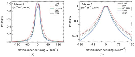 Similarly, the results of the code calculations for the higher density case (ne = 1016 cm−3) and the same temperatures as in the previous subsection are respectively illustrated in Figure 4, Figure 5 and Figure 6 which refer to subcases 4, 5, and 6, respectively. For this density, the expected discrepancy between the calculations carried out by the PPP code using the GBK collision operator and those of the other codes are more pronounced, confirming the non-validity of this form of this operator at high densities and low temperatures even though it tends to disappear with increasing temperatures. One can see that for the remaining calculations, SimU agrees well with QC_FFM on the one side and ZEST agrees well with LSNS on the other side. Note that the profiles calculated by LSNS and ZEST are a bit broader than those calculated by SimU and QC_FFM. These agreements concern the overall profiles, the line widths, and wings, but not the line center dip for which there are some discrepancies between the various code calculations.