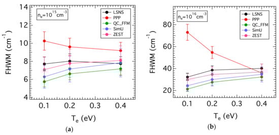 The H-β line FWHM versus the electron temperature as deduced from the profiles calculated by the codes. (a) Lower electron density (ne = 1015 cm−3); (b) Higher electron density (ne = 1016 cm−3).