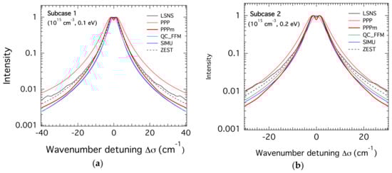 This section briefly describes the different codes contributing to this case study. Five codes were involved: two simulation methods and three models. The simulation codes are LSNS and SimU. LSNS involves a numerical integration of the time-dependent Schrödinger equation for the hydrogen wave function under the influence of a fluctuating electric field obtained from a particle simulation. More details can be found in Reference [] and the references therein. SimU is well described in References [,]. The three models are PPP [], QC_FFM (Reference [] and the references therein) and ZEST. Since the ZEST (ZEeman-STark) line-shape code has been improved and upgraded to a new version [], here, we describe the version that has been used for the calculations reported in this paper. ZEST relies on a quasi-static description of the ions and an impact approximation for the electrons. The Hamiltonian of the radiator includes the Stark effect in the dipole approximation for arbitrary multi-electron ions as well as the Zeeman Effect accounting for a static magnetic field. The impact of the magnetic field on the electron trajectories is not taken into account. The electrons are described by a collision operator calculated up to the second order of the electron-radiator interaction using the model reported in Reference []. The distribution of quasi-static ion fields is evaluated using analytical formulas adjusted on many Monte-Carlo simulations as a function of the plasma ion coupling parameter and the effective electron-ion screening parameter [,]. At the time of the calculations, ZEST neglected the collisional shift due to the electrons, the interference terms between upper and lower states, the non-diagonal terms of the collision operator, and the frequency dependence of the impact width. Using the unitary transformation that diagonalizes the radiator Hamiltonian, the resulting profile is then written as a sum of Lorentzian functions (or Voigt functions when accounting for the Doppler Effect) weighted by the strength of the Stark components and by the probability of the quasi-static ion fields. At the time of the calculations presented here, the ZEST code did not include the ion dynamics effects. Now, in the most recent version of ZEST [], the ion dynamics effects are modeled within the framework of the fast Frequency-Fluctuation Model (fast FFM) []. In the next section, we compare the calculated profiles and the full widths at half-maximum for six subcases corresponding to the two densities ne = 1015 cm−3 and ne = 1016 cm−3.