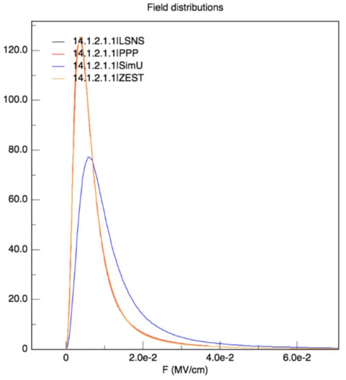 To be complete in the code comparisons and for a better understanding of the differences between the calculated profiles, we present the field distribution used by the codes except for QC_FFM on Figure 10 for the lowest density ne = 1015 cm−3. One can see no difference between the distributions calculated by LSNS, PPP, and ZEST but that which was calculated by SimU is different. This is not surprising since SimU, by simulating both electrons and ions, provides the total electric field corresponding to the doubled charge density. Its distribution is broader and shifted towards higher field values. For the other codes, the field distributions shown here are for ions only.